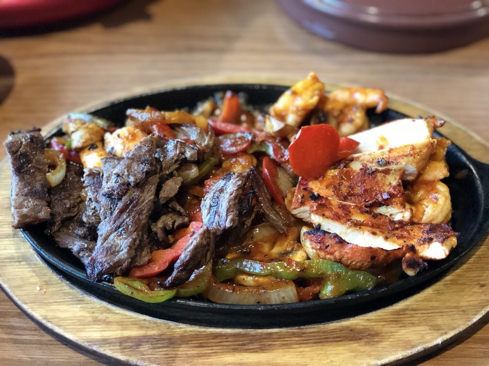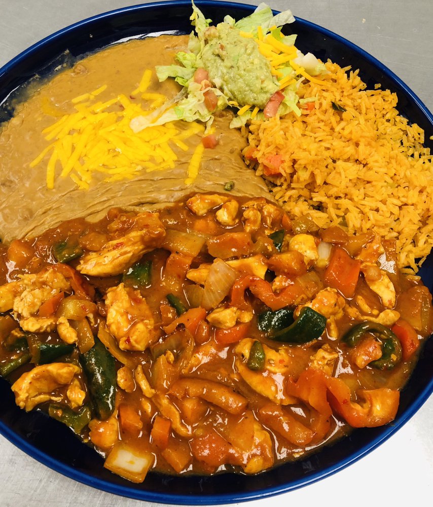 Delicious bowl of chicken and beef strips, sauteed in a mild spicy sauce with mushrooms, onions and tomato topped with melted Monterey Jack cheese, sliced avocados, rice and beans