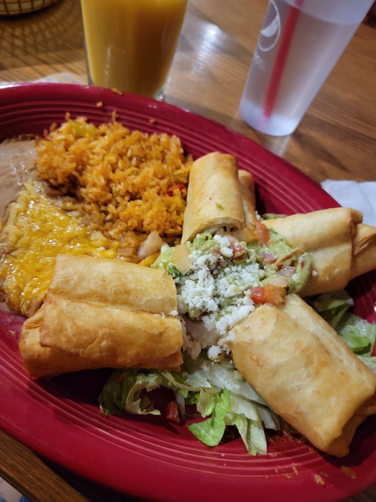 Deep-fried corn tortilla rolled and filled with your choice of chicken or shredded beef. Served with lettuce, tomatoes, guacamole, sour cream, rice and beans