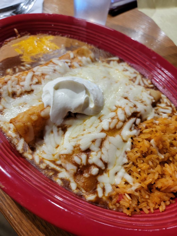 Two corn tortillas stuffed with your choice of ground beef, chicken or picadillo, smothered with enchilada sauce and melted cheese
