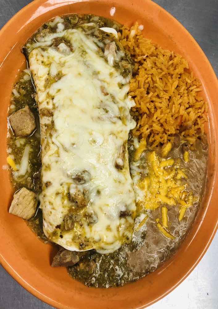 A flour tortilla stuffed with chucks of pork in a light tomatillo sauce and covered with melted cheese