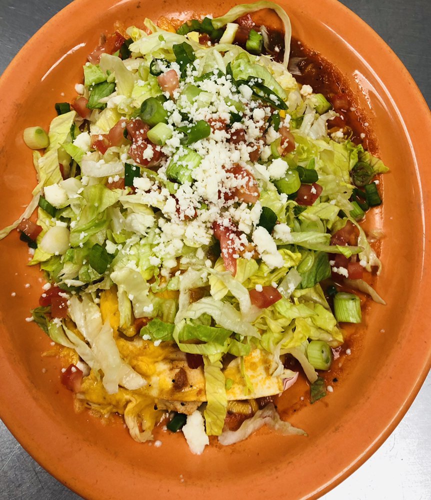 Three corn tortillas dipped in a ranchera sauce and stuffed with your choice of ground beef, chicken or picadillo, topped with melted cheese, lettuce, tomato, onions, parmesan cheese, sour cream and guacamole